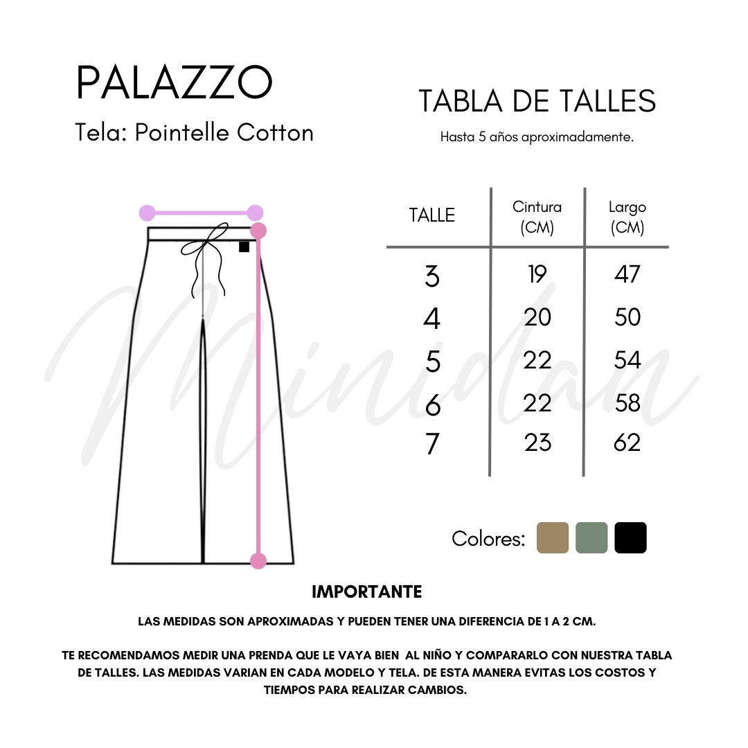 Su diseño pointelle aporta un detalle delicado y elegante, haciendo que cada movimiento sea aún más especial. Perfecto para usar en cualquier estación, este Palazzo es una opción práctica y moderna para el guardarropa infantil.